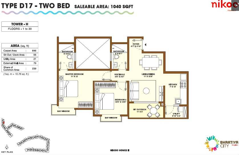 Units and Interiors:. Bhartiya City Nikoo Homes II comprises of 1 BHK, 1.5 BHK, 2 BHK, 2.5 BHK, 3 BHK and Studio BHK Apartments that are finely crafted and committed to provide houses with unmatched quality. The Apartments are spacious, well ventilated and Vastu compliant.