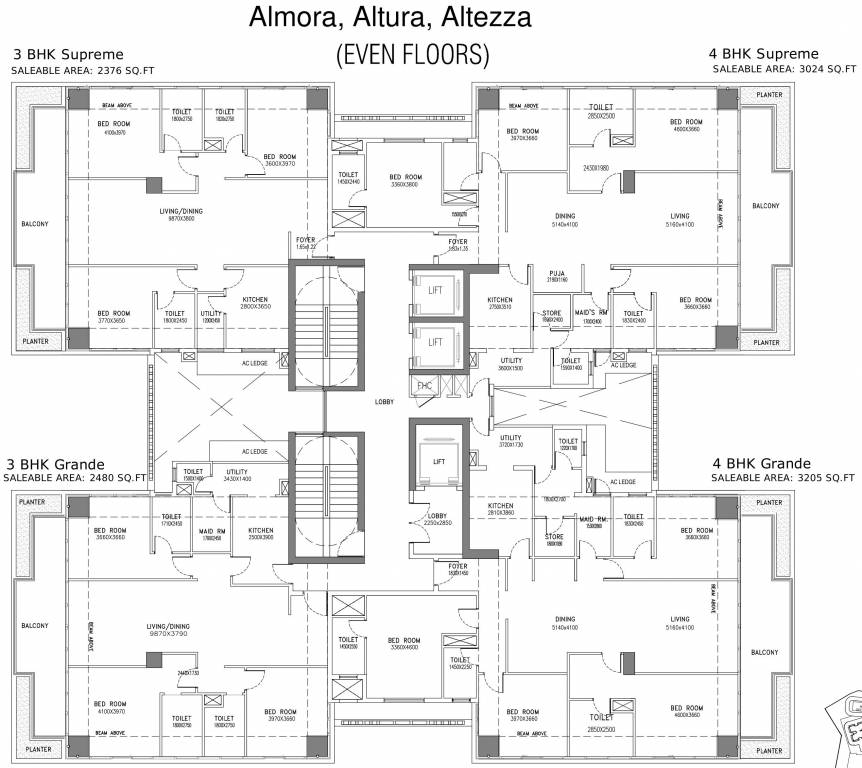 Large size 3 and 4BHK units ranging between 122.63 to 173.91 Sq.M. RERA Carpet Area are available across 4 towers