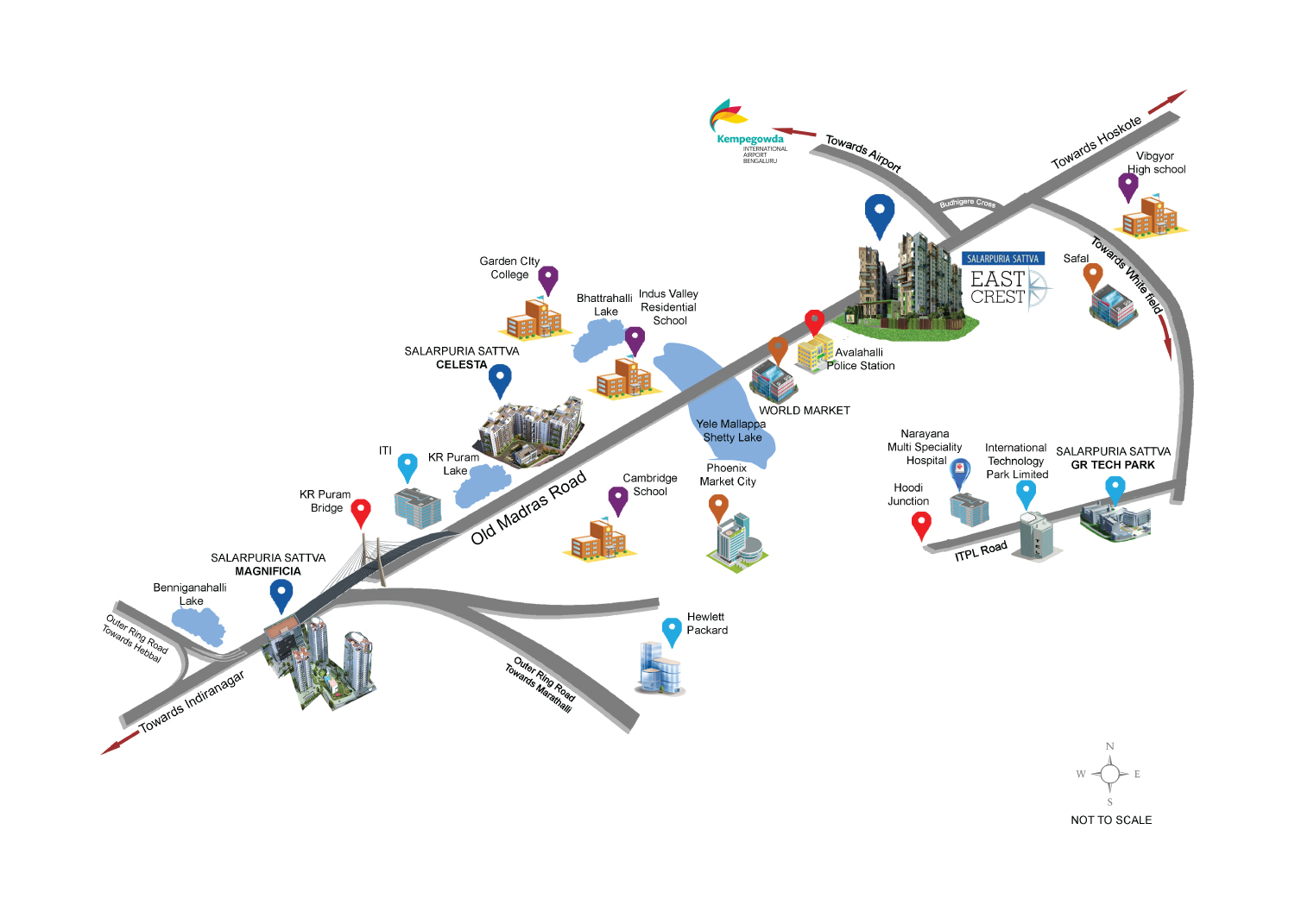 Salarpuria Sattva East Crest, is Salarpuria Sattva’s premium residential project coming up in the East of Bangalore ,Spread over an area of 6.6 acres, Featuring 667 apartments, spread over 11 towers near Old Madras Road (OMR), just before the Budigere Cross and right at the junction of the evolving eastern IT Corridor. It lies between Whitefield and the International Airport connecting emerging SEZ zones. OMR and Budigere cross are the real estate hot spots in Bangalore today with tremendous investment potential. The Budigere junction represents the importance of the East and the point from which Bangalore continues to grow towards Hoskote.
